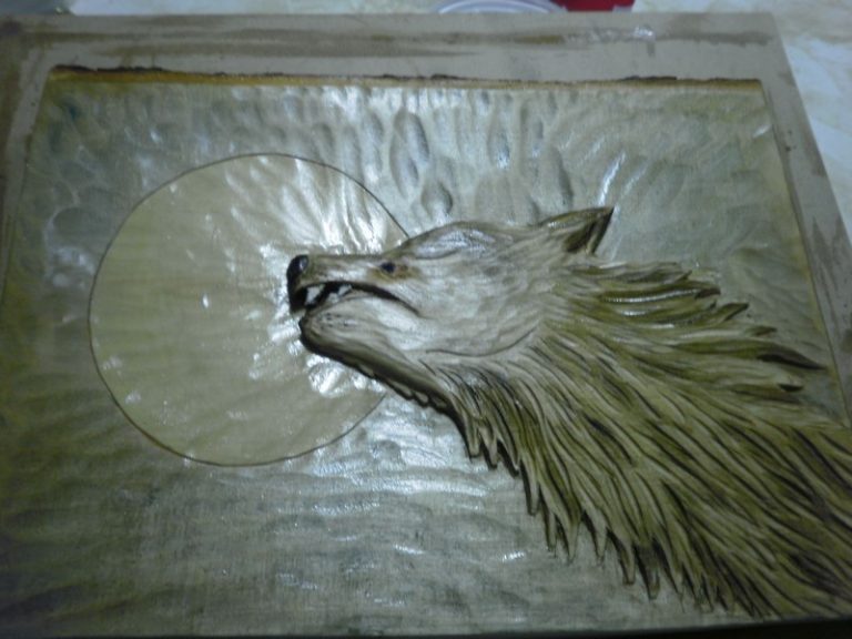 Loup où es-tu..?Que fais-tu ?…Sculpture bas relief entièrement faite au couteau dans du tilleul. Belle journée à vous partager…