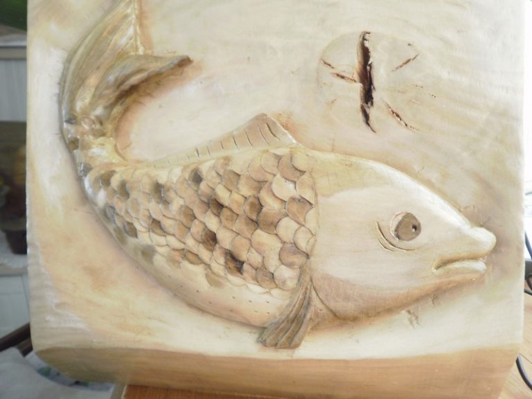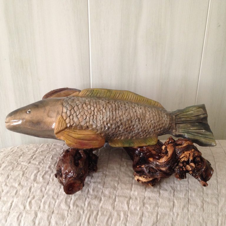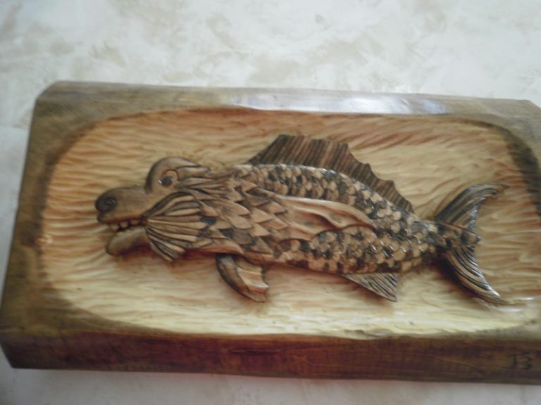 Et non, celui-ci ne sort pas de l’eau, mais bel et bien du bois! Bois: Tilleuil Outils: Couteaux de sculpteurs et gouges Teinture à l’eau et vernis satiné (incolore)