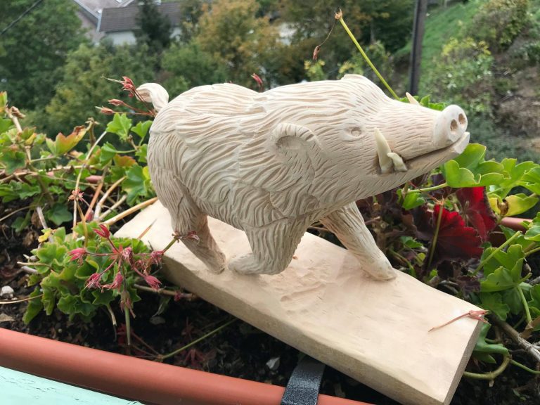 Petit sanglier, collé sur un support (écorce d’arbre). Bois: Chêne (bois dur).