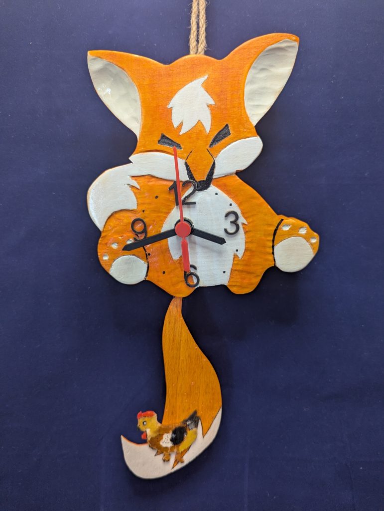 🦊 Le renard et sa malice – Avec sa queue mobile servant de balancier, ce renard espiègle, accompagné d’une petite poule, apporte une touche dynamique et poétique à votre intérieur. Une horloge qui plaira aux amateurs d’animaux et de finesse artisanale.