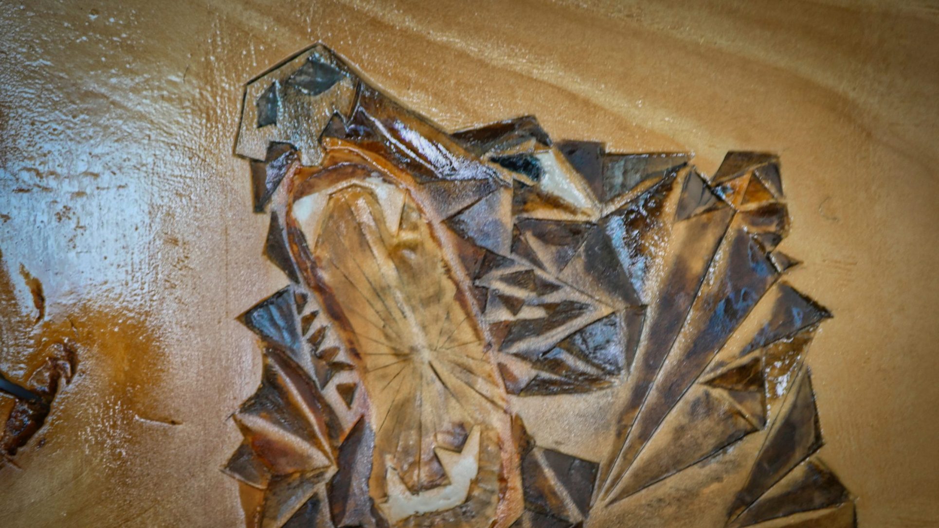 Cette sculpture en bois représente un ours qui hurle pour se défendre, sculpté en bas relief à la gouge et au couteau.