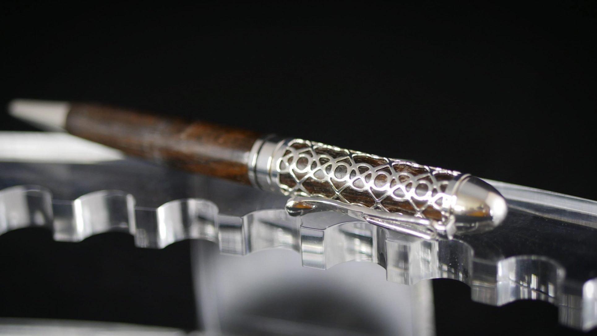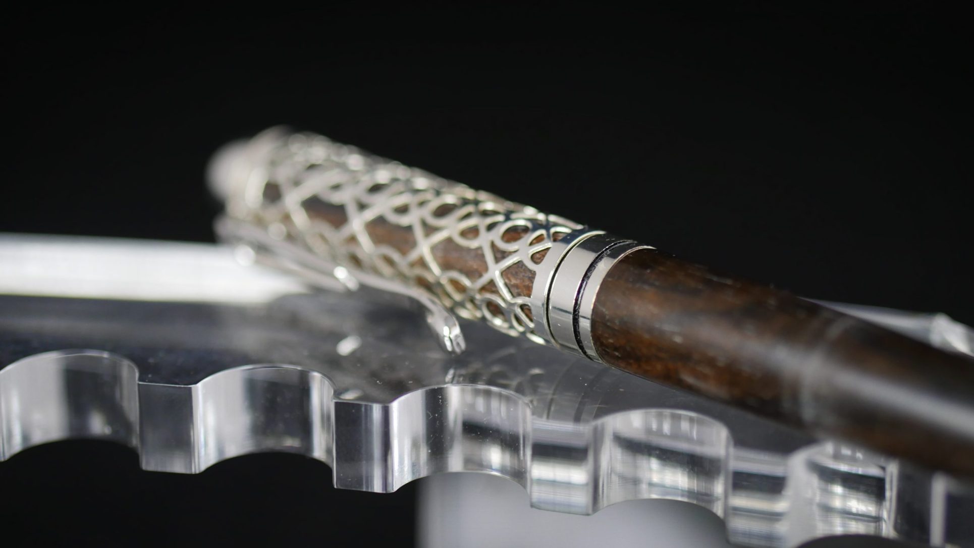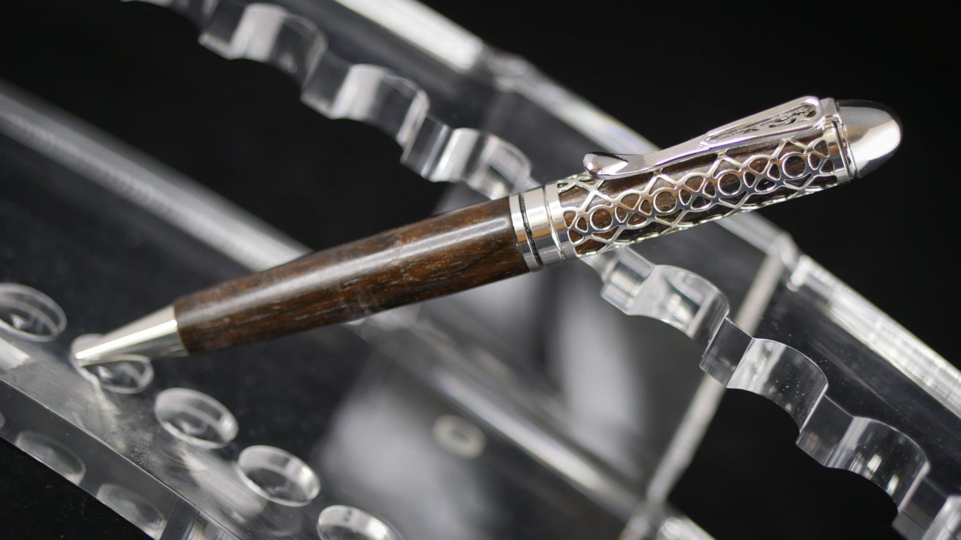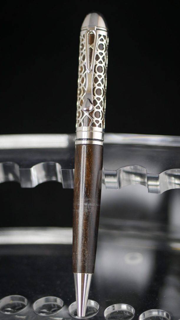 Découvrez notre stylo artisanal au design « dentelle » élégant et unique. Réalisé au tour à bois dans du palissandre du Honduras et assemblé à la main.