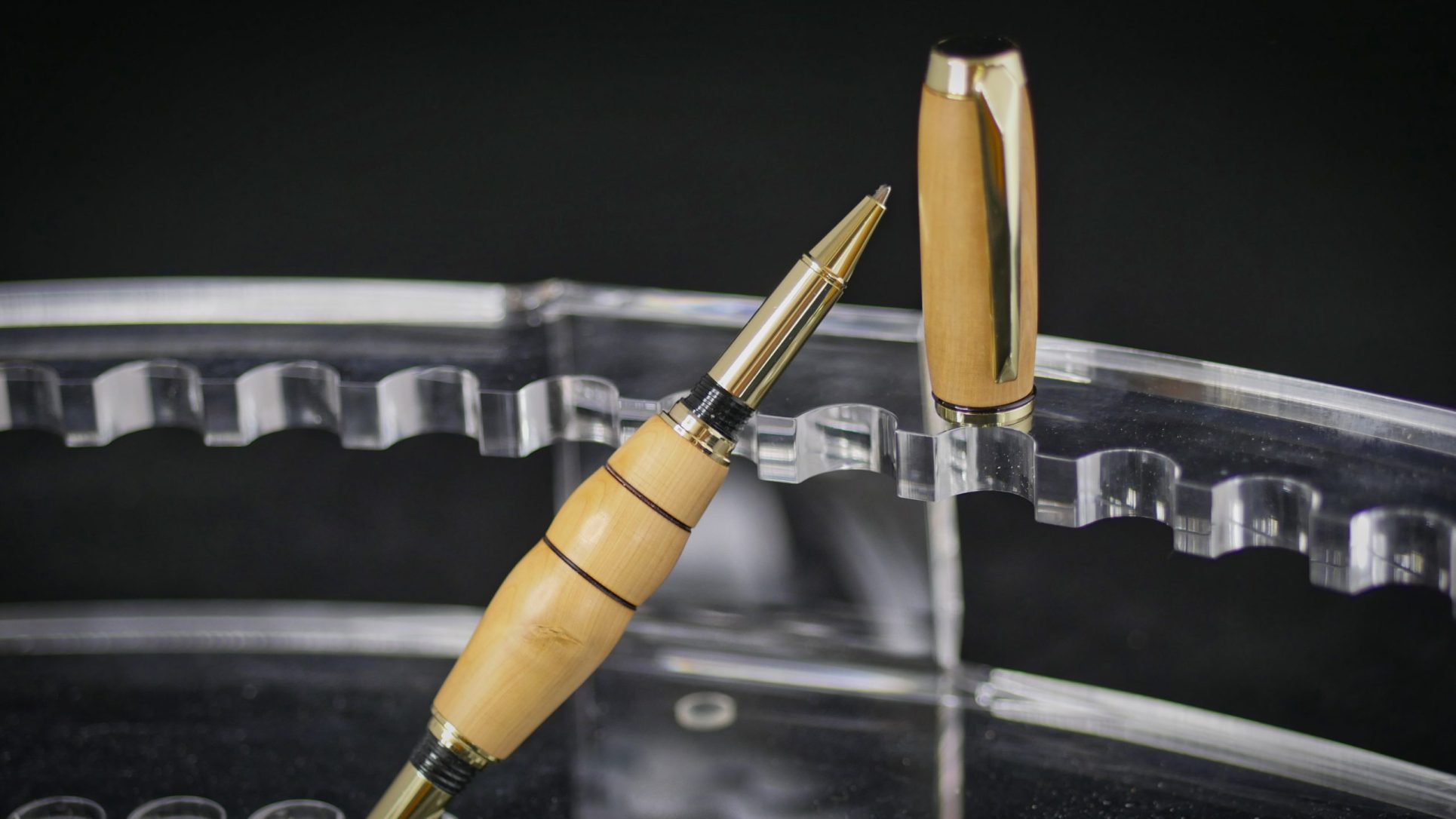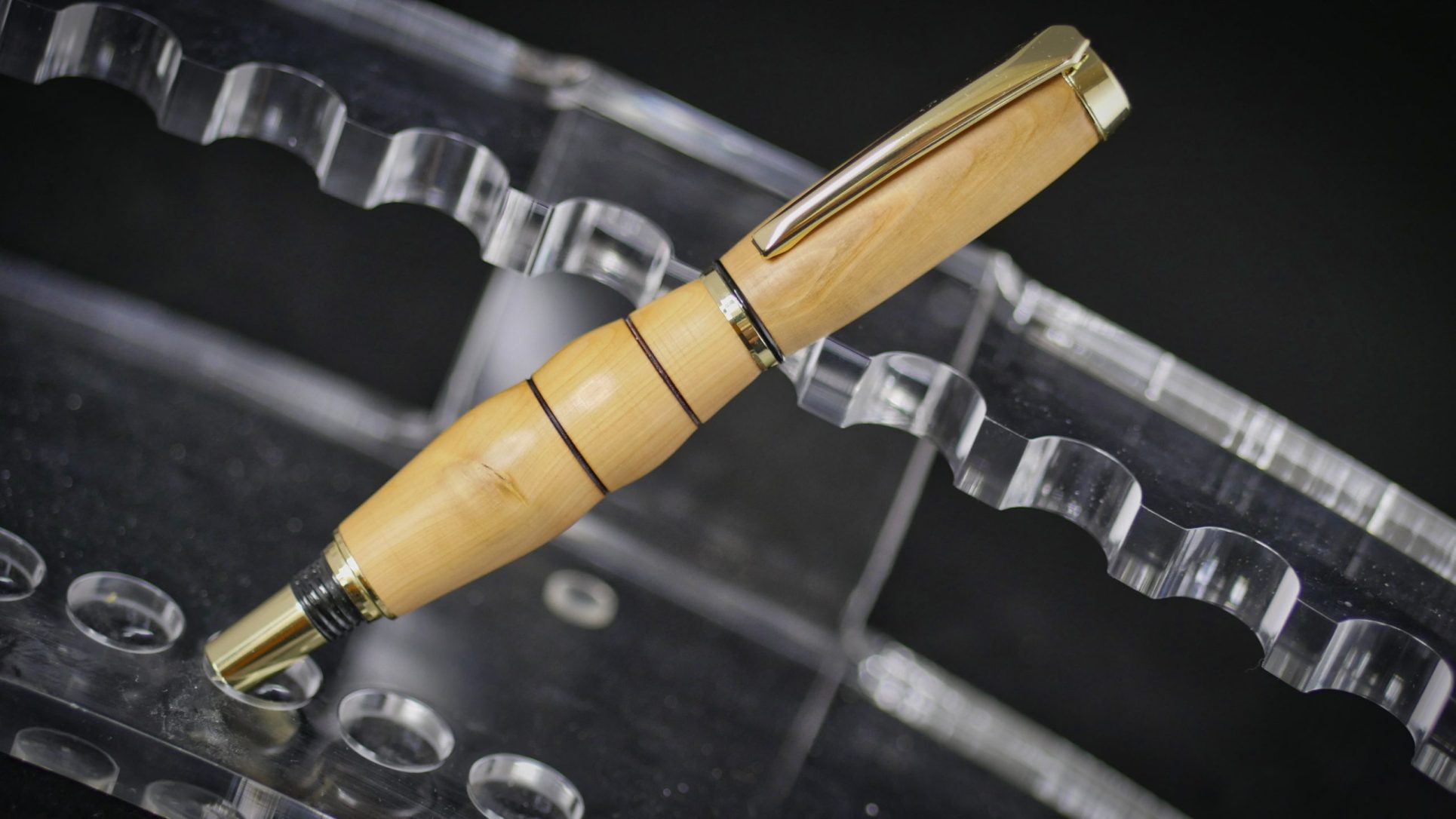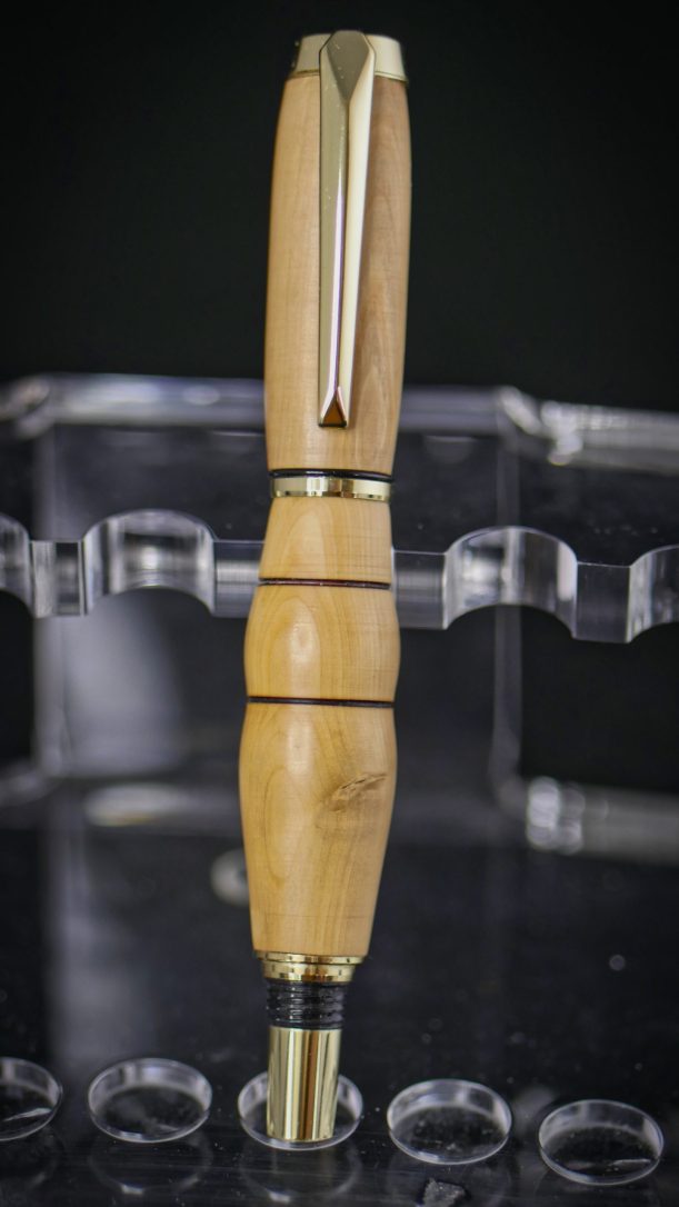 Stylo en bois de if clair avec mécanisme doré, courbes hors norme pour grande prise en main.